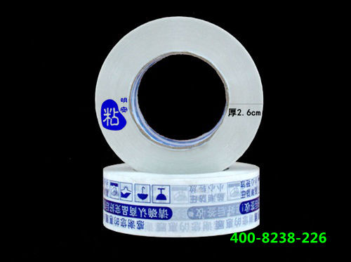 印刷胶带是以双向拉伸聚丙烯薄膜(BOPP)为基材,印刷胶带具有高抗拉伸力,无毒无味并且环保。印刷胶带是在BOPP上面印上各种文字图案,然后涂上相应的颜色的压敏胶制作而成。